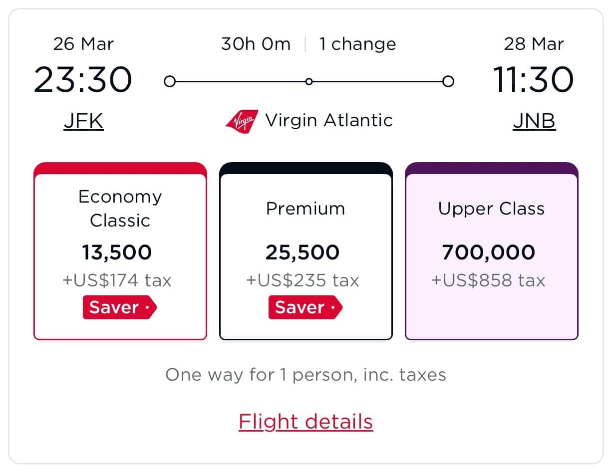 From London, Virgin Atlantic also operates flights to Cape Town (CPT) and Johannesburg (JNB). Johannesburg typically has more availability, so it may be easier to find a redemption at the saver level there.