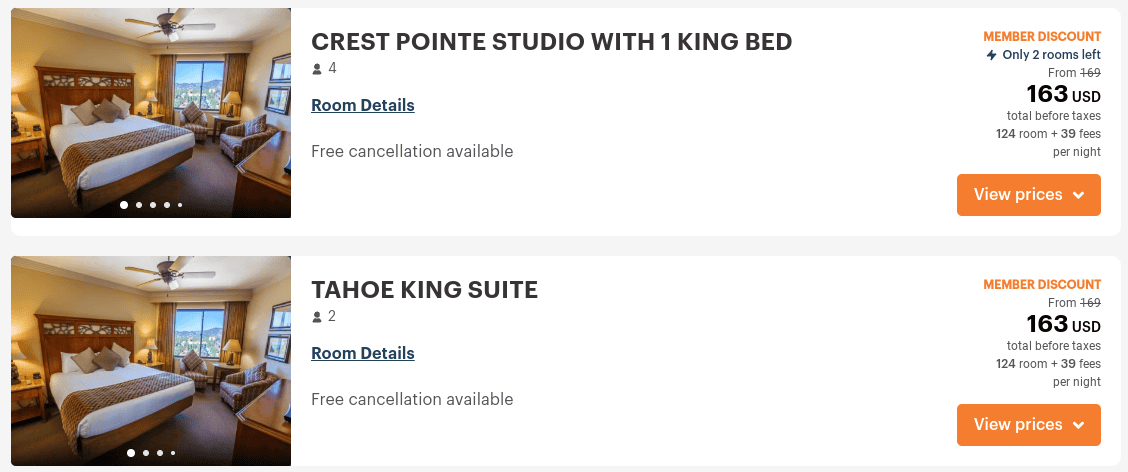For the value you’ll get at the Holiday Inn Club Vacations Tahoe Ridge Resort, the cash prices are very low. On the lowest end, we found a Crest Pointe Studio with 1 King Bed in February 2025 for just $163 per night. This room sleeps four people with one king-sized bed and one queen-sized pullout sleeper sofa.