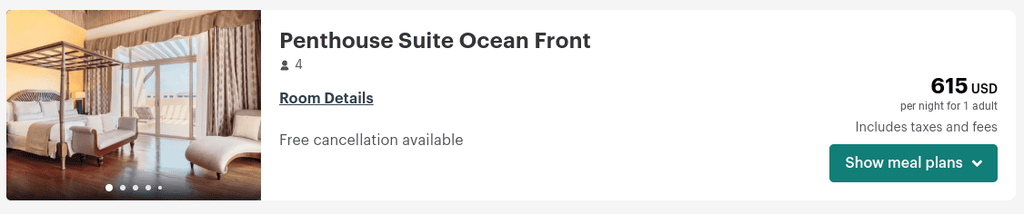If you want the finest luxury that this all-inclusive resort has to offer, you could book the Penthouse Suite Ocean Front, which costs $615 for a night in August 2025.