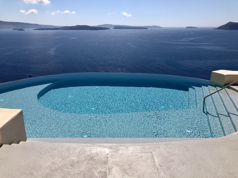 Mystique offers 2 pools on its property – one at the very bottom of the hill directly below the lobby and next to the Charisma restaurant. In fact, the table in Charisma sits right next to the overflow part of the infinity edge of the pool, and is often wet. But it offers a stunning view of the Caldera directly over its infinity edge.